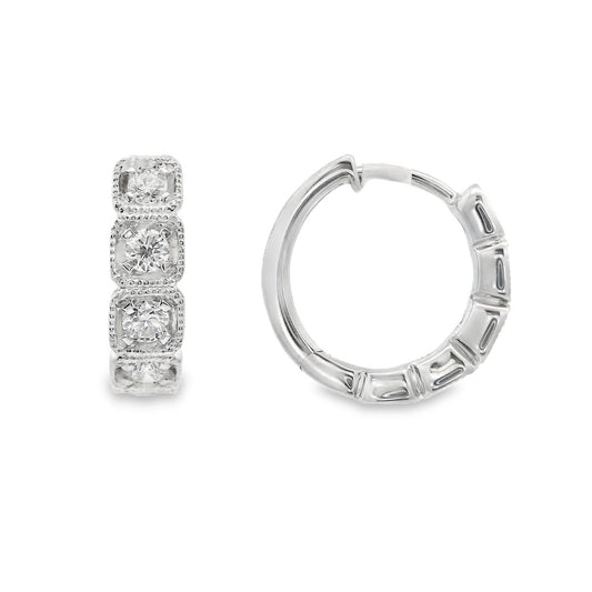 14K White Gold - Milgrain Diamond Hoop Earrings - J37822